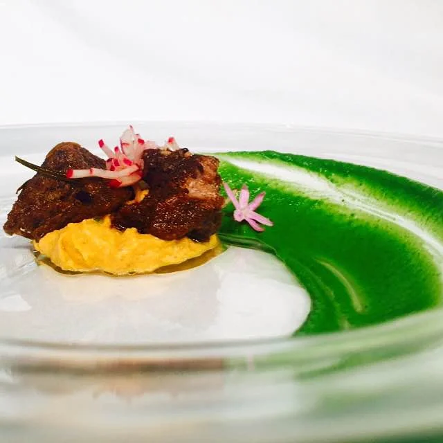 Res Confitada por 8 hrs + Puré de Chícharo + Romesco + Rábano en Naranja