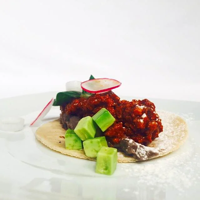 Taco de Adobo de Chiles y longaniza + Puré de Frijol con hoja de aguacate + Cebolla + Acelga + Rábano