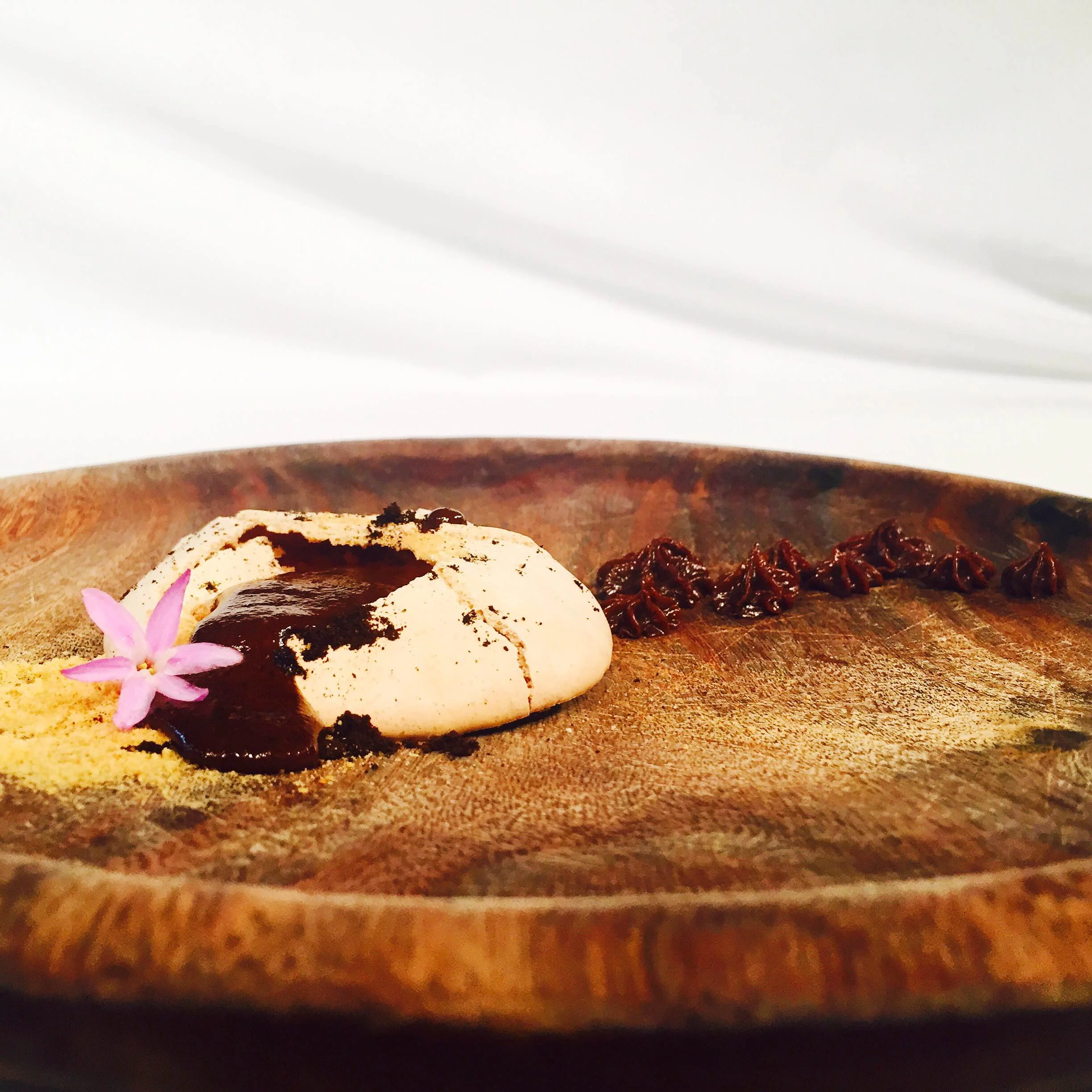 Pre Postre: Merengue + Ganache de Chocolate de mate + Salsa caliente de Chocolate y Almendra.