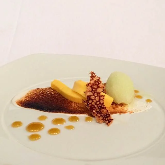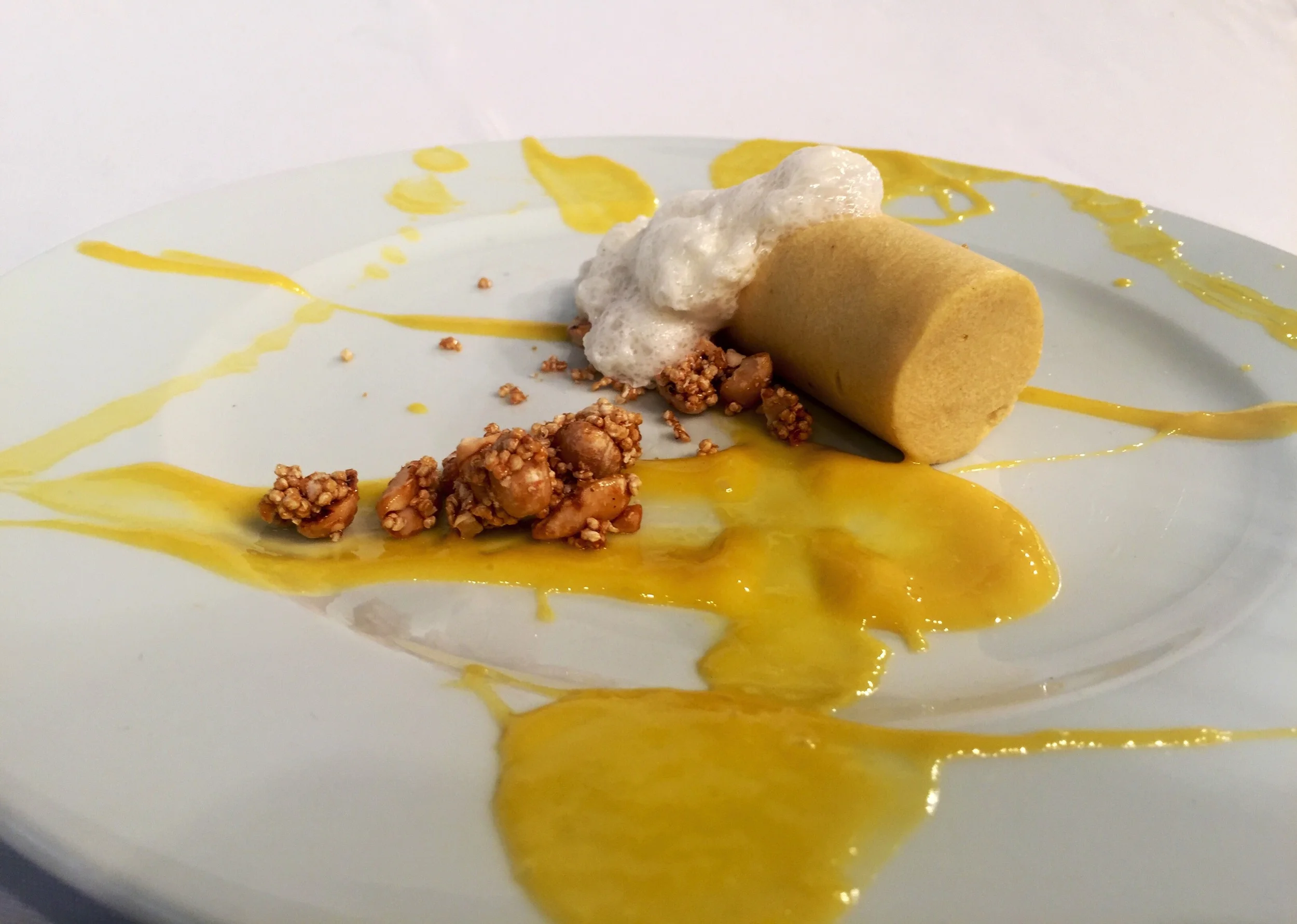 Séptimo Tiempo: Camote amarillo y Jengibre + Salsa de mango y yoghurt Griego + Aire de coco + Palanqueta de almendra y nuez
