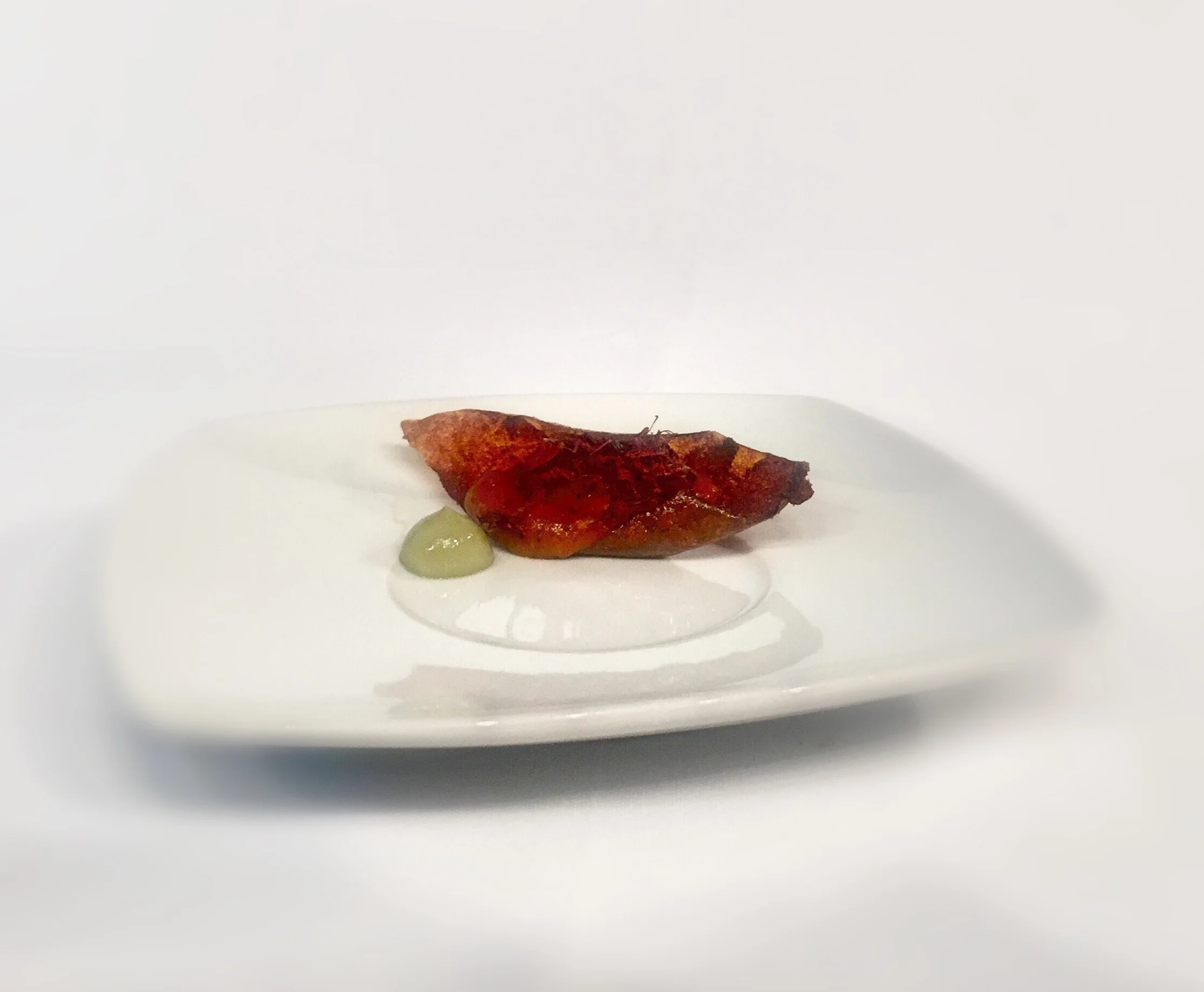 AB: Piel de jitomate frita + Chapulines ahumados en hoja de aguacate + Adobo de Mixiote + Puré de salsa verde cruda.