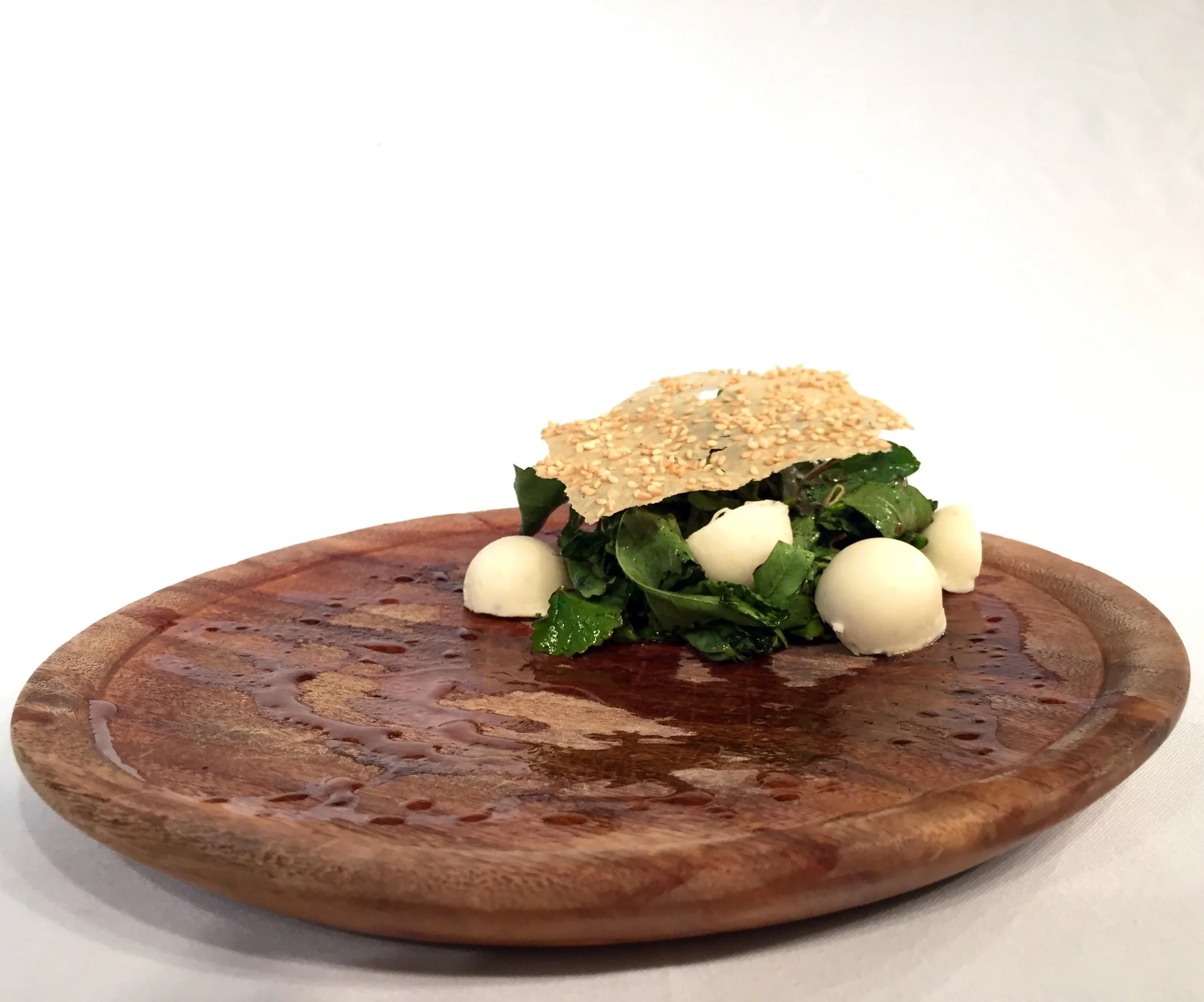 Segundo tiempo: Quelites de Atlixco + Quesillo + Vinagreta de Chiltepin miel y toronja + Papel de ajonjolí
