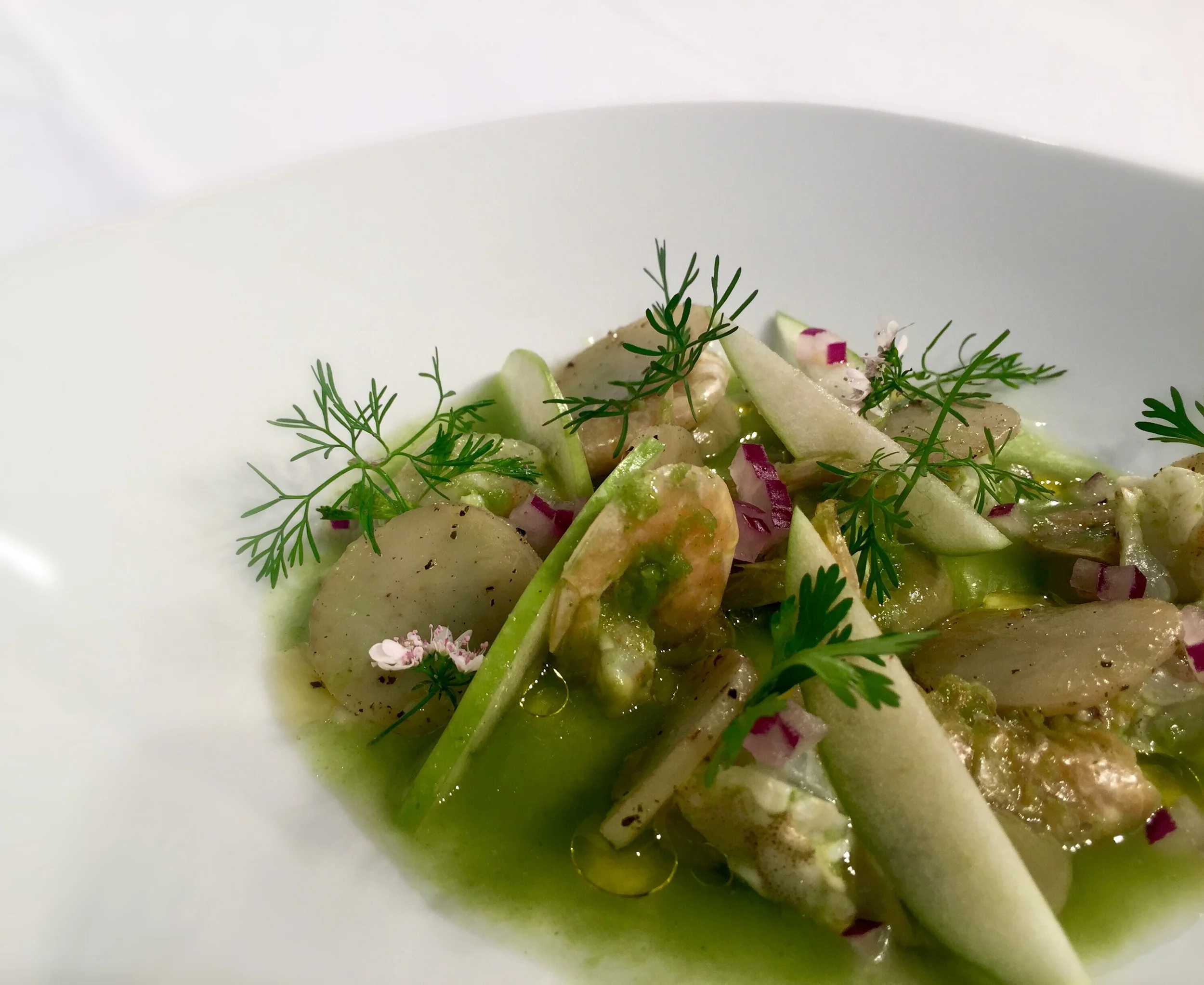 Tercer Tiempo: Agua chile de camarón seco y fresco + Cremoso de Aguacate y Pipicha + Cilantro criollo + Papa Confitada + Manzana verde