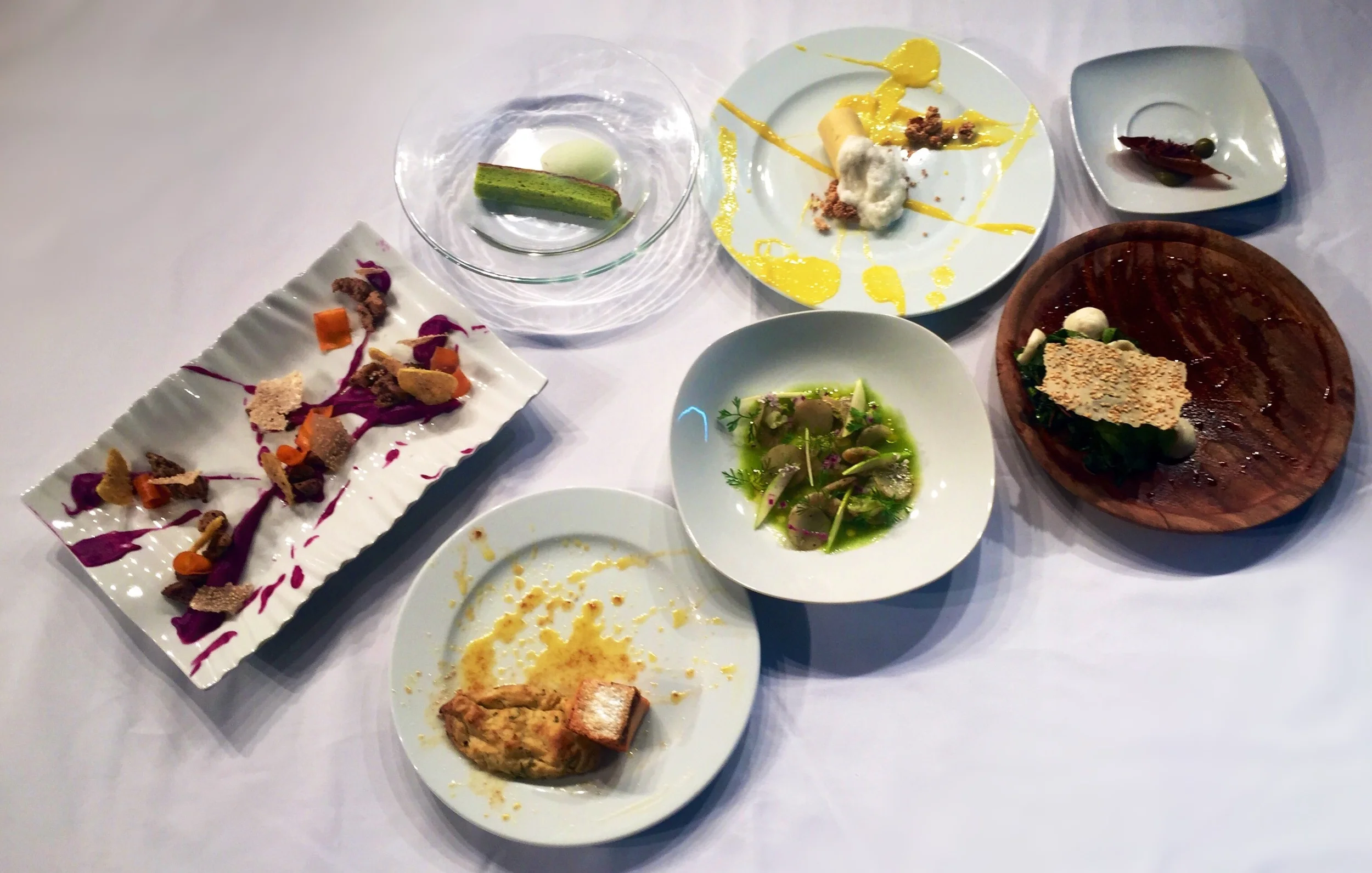 Quinto Tiempo: Pavo en semilla de mostaza + Camote morado + Zanahoria confitada + Plátano macho + Papel de Amaranto